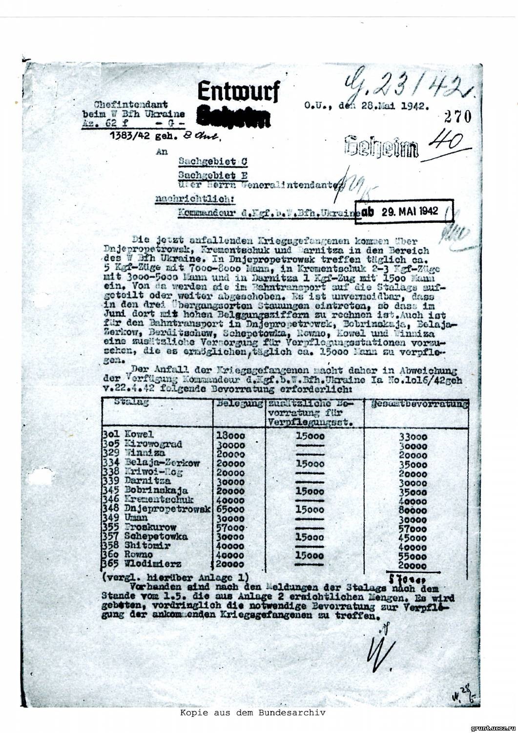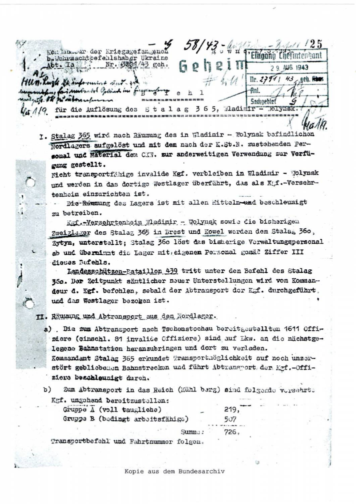 1. По свидетельствам офицеров и служащихвермахта из Офлага [офицерский лагерь] XIa во Влодзимеже [Владимир-Волынский] оберлейт. Дувал и оберлейт. Лессенхоп – оба абвер, казначей Швартинг, служащие Янс, Телтхерстер, Биттинс, Зибен и Беттель) в данный момент ликвидируется все еврейское население Украины. Говорят, что из Киева было вывезено 42000-48000 (показания разнятся) под предлогом переселения. Затем у них забрали одежду и расстреляли в большом рву.