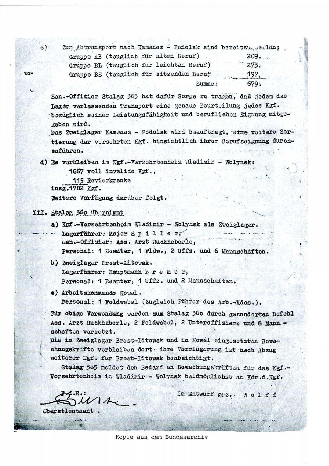 2. Схожая казнь состоялась 29.10. в Ровно.Солдатам после семи вечера запретили покидать казармы. Около 17000 евреев (включая женщин, детей и младенцев) было расстреляно за городом. До того все должны были раздеться, женщинам разрешили остаться в трусах. Согласно рассказам в столовой Офлага XIa казнимые должны были по трое, лицом к земле, раскинув руки и ноги, ложиться друг на друга, после чего их расстреливали из автоматов. После казни склоны рва были взорваны, так что тела оказались погребены под перемещенными взрывом земляными массами. Окружной комиссар Влодзимежа Вестерхайде подтвердил эту казнь во время разговора (9.12 – открытие нового офицерского клуба во Влод.) между ним и капитаном Мессманном (Gen.d.Art.b.Ob.d.H.), причем нижеподписавшийся сидел на том же конце стола и слышал все сказанное. Окружной комиссар Вестерхайде раскритиковал плохую организацию казни. Толщина слоя земли над казненными составляла лишь 1 метр, поэтому на следующий день собаки выкопали тела. Он также сказал о том, что евреи Влодзимежа (около 17000) уже были бы ликвидированы, если бы не трудности с местными грунтами. «Вы не представляете, какие земельные массы надо сдвигать с места».