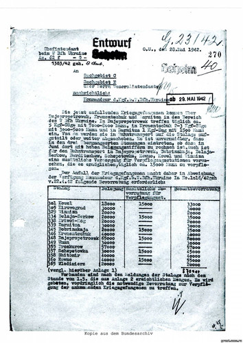 10. Окружной комиссар Вестерхайде изложил застолом свою программу. Согласно ей школы во Влод. закрыты, чтобы не допустить возникновения украинской интеллигенции. По его словам, запланировано воспитание простого крестьянского населения, которое может получать товары из каравансараев у автострад. Украина должна через 50 лет стать областью Рейха, Россия через 200 лет. Майор Хофманн (Gen.d.Pio.u.Fest.b.Ob.d.H) в ответ указал, что Киев должен быть взорван. Подготовительные мероприятия идут.