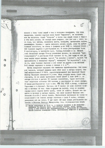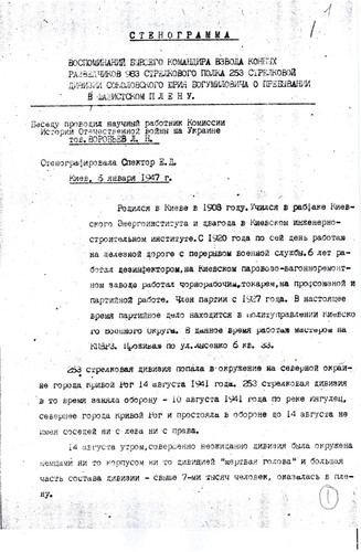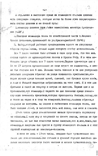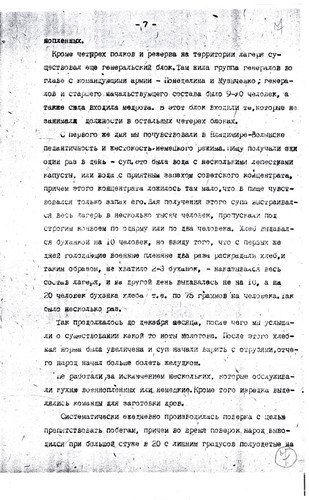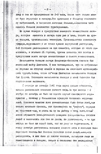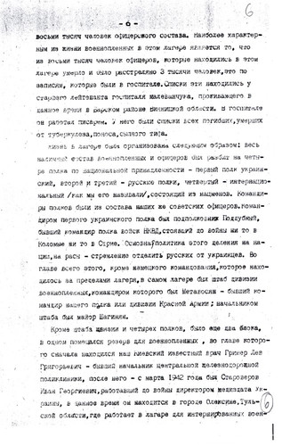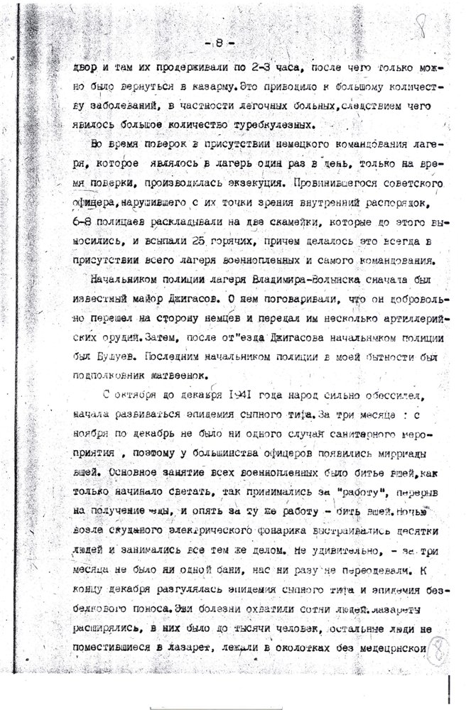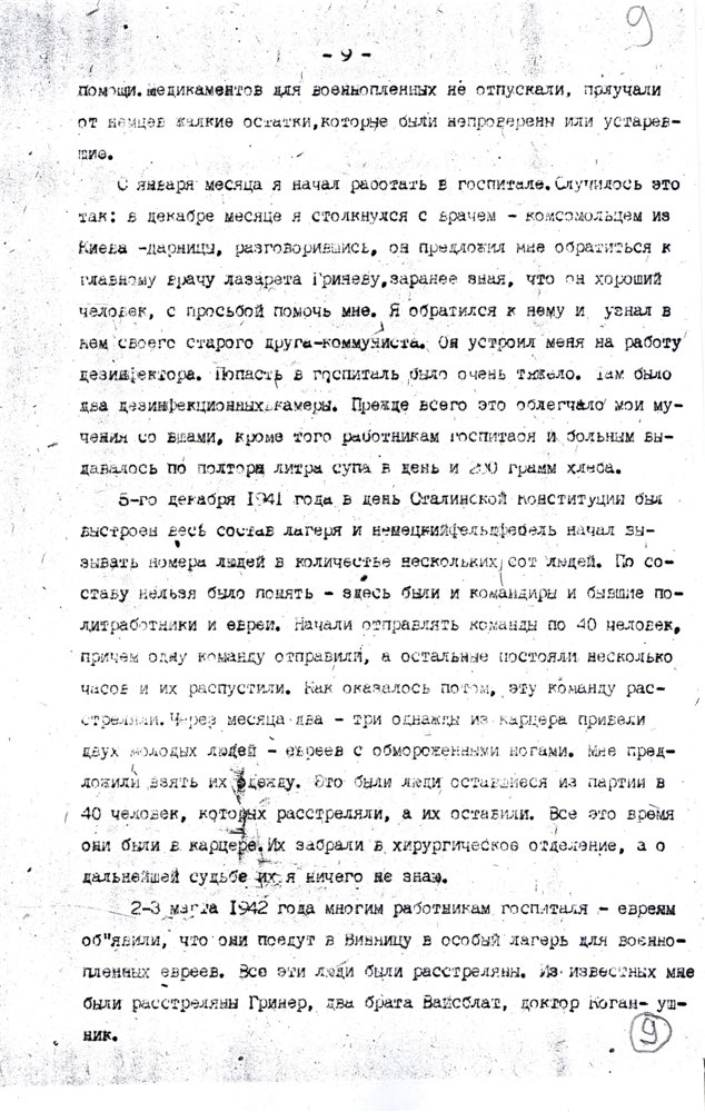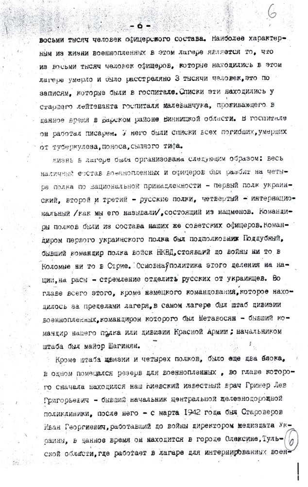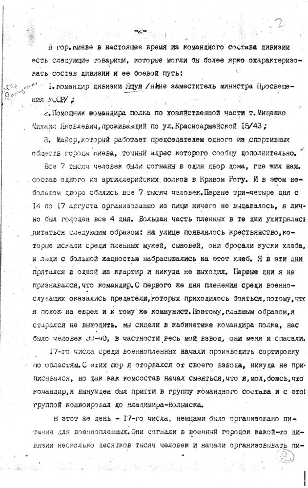«…меня скоро перебросили в лагерь Владимир-Волынск, где была создана из 20 ч(еловек) команда (похоронное бюро), которые не успевали копать ямы – так люди умирали с голода. В этот лагерь приезжали подполковник и майор из власовской армии, вербовали пленных в РОА. Им удалось записать 500 ч(еловек), а когда они уехали, я и др(угие) стали среди этих людей вести пропаганду, что они идут против своих отцов, братьев и сыновей, им стало стыдно, они стали говорить, что они идут куда попало, чтобы с голоду не умереть, но мы им доказали, что там вас пошлют на фронт впереди себя и вы все погибнете раньше, чем здесь. Эта пропаганда мне обошлась у зондерфюрера большой потерей здоровья и крови, и затем меня поселили в барак, ограждённый проволокой внутри лагеря, где находились 16 ч(еловек) евреев. Потом прислали политрука с Марьиной Рощи, как он говорил, по фамилии Биян (в оригинале фамилия написана очень неясно и прочтена предположительно) и политрука-украинца. После нашей агитации люди заколебались и некоторые отказались идти в РОА, за что их в скором времени отправили на этап, а меня, политрука-украинца отправили в лагерь Дубно». Источник: РГАЛИ, ф.2528, оп.4, д.204, л.51."