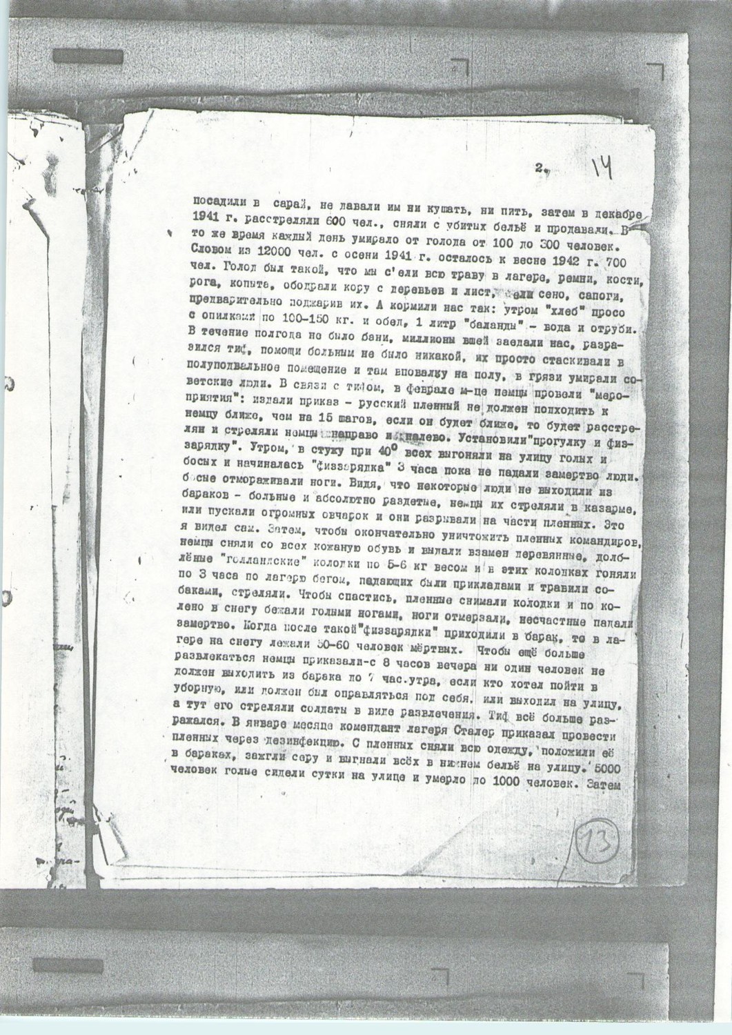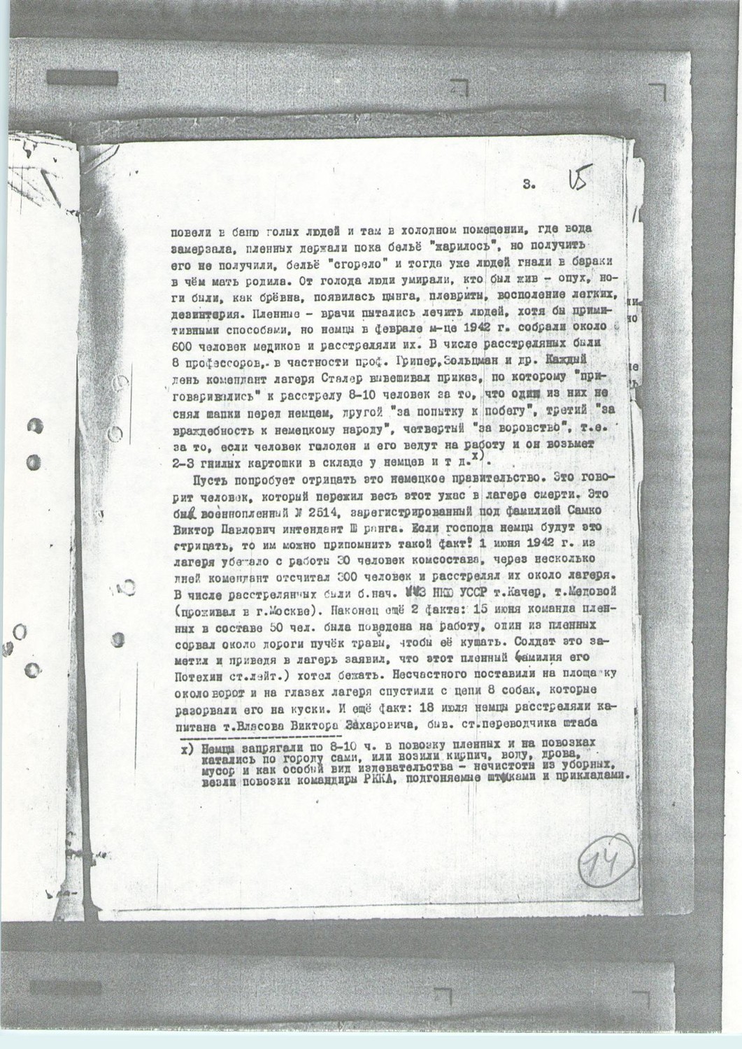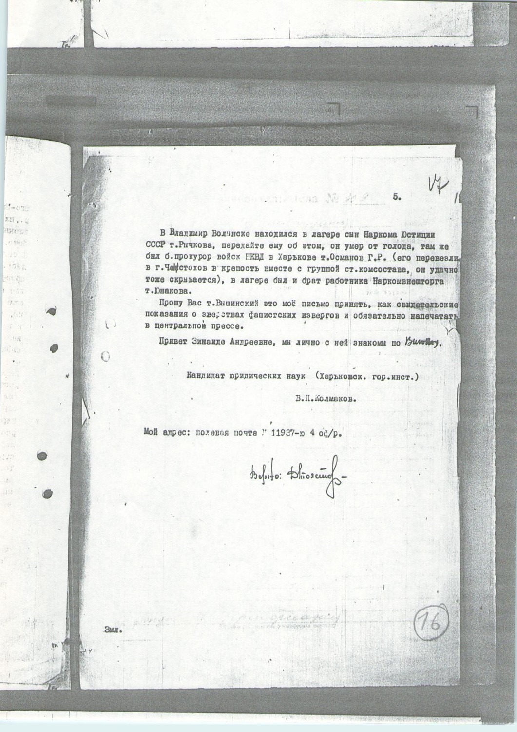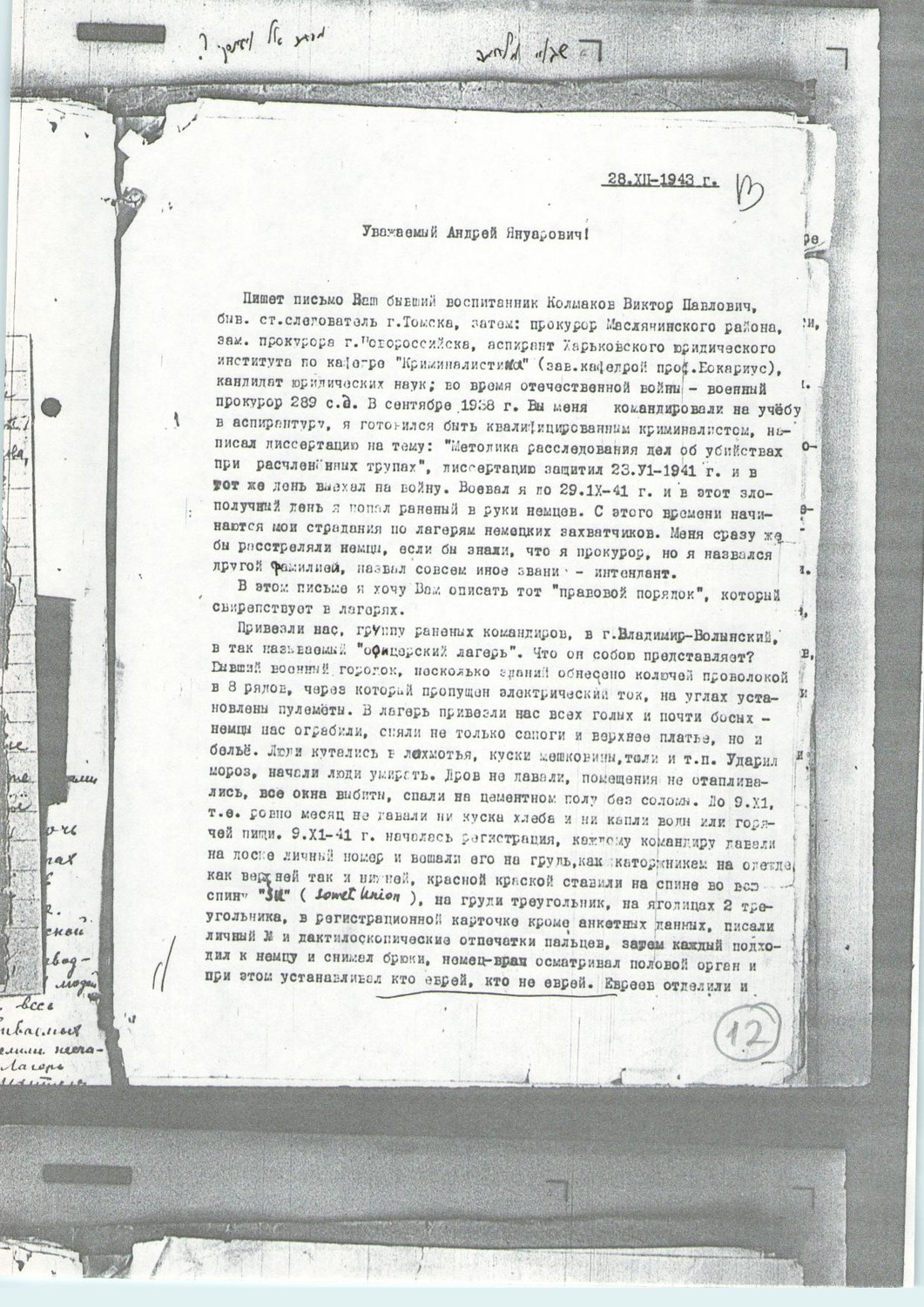«28.XII-1943 г(ода) Уважаемый Андрей Януарьевич! Пишет Вам бывший воспитанник Колмаков Виктор Павлович, быв(ший) ст(арший) следователь г(орода) Томска, затем: прокурор Маслянинского района (Новосибирской области РСФСР), зам(еститель) прокурора г(орода) Новосибирска, аспирант Харьковского юридического института по кафедре «Криминалистика» (зав(едующий) кафедрой – проф(ессор Николай Сергеевич) Бокариус), кандидат юридических наук; во время Отечественной войны – военный прокурор 289 с.д. В сентябре 1938 г(ода) Вы меня командировали на учёбу в аспирантуру, я готовился быть квалифицированным криминалистом, написал диссертацию на тему: «Методика расследования дел об убийствах при расчленённых трупах», диссертацию защитил 23.VI-1941 г(ода) и в тот же день выехал на войну. Воевал я по 29.IX-(19)41 г(ода) и в этот злосчастный день попал раненый в руки немцев. С этого времени начинаются мои страдания по лагерям немецких захватчиков. Меня сразу же бы расстреляли немцы, если бы знали, что я – прокурор, но я назвался другой фамилией, назвал совсем иное звание – интендант. В этом письме я хочу Вам описать тот «правовой порядок», который свирепствует в лагерях. Привезли нас, группу раненых командиров в г(ород) Владимир-Волынский, в так называемый «офицерский лагерь». Что он собой представляет? Бывший военный городок (Войска Польского, затем - РККА), несколько зданий обнесено колючей проволокой в 8 рядов, через которые пропущен электрический ток, на углах установлены пулемёты. В лагерь привезли нас всех голых и почти босых – немцы нас ограбили, сняли (с нас) не только сапоги и верхнее платье, но и бельё. Люди кутались в лохмотья, куски мешковины, толя и т(ому) п(одобное). Ударил мороз, начали люди умирать. Дров не давали, помещения не отапливались, все окна (были) выбиты, спали (мы) на цементном полу без соломы. До 9.XI(.1941), т(о) е(сть) ровно месяц (нам) не давали ни куска хлеба и ни капли воды или горячей пищи. 9.XI-(19)41 г(ода) началась регистрация, каждому командиру давали на доске его личный номер и вешали его на грудь, как каторжанам, на одежде, как верхней, так и нижней, красной краской ставили на спине во всю спину “SU” (Sowjetünion), на груди – треугольник, на ягодицах – 2 треугольника, в регистрационной карточке, кроме анкетных данных, писали личный № и (проставляли) дактилоскопические отпечатки пальцев, затем каждый подходил к немцу и снимал брюки, немец-врач осматривал половой орган и при этом устанавливал, кто еврей, кто не еврей. Евреев отделили (от остальных) и посадили в сарай, не давали им ни кушать, ни пить, затем, в декабре 1941 г(ода) расстреляли (их )600 чел(овек), сняли с (них) убитых бельё и продали (его). В то же время каждый день умирало от голода от 100 до 300 человек. Словом, из 12000 чел(овек) с осени 1941 г(ода) осталось к весне 1942 г(ода) 700 чел(овек). Голод был такой, что мы съели всю траву в лагере, ремни, кости, рога, копыта, обдирали кору с деревьев и лист(ья), ели сено, сапоги, предварительно поджарив их. А кормили нас так: утром «хлеб» (просо с опилками) по 100 – 150 кг (так в оригинале; следует читать «грамм»), и обед – 1 литр «баланды» (вода и отруби). В течение полугода не было бани, миллионы вшей заедали нас, разразился тиф, помощи больным не было никакой, их просто стаскивали в полуподвальное помещение, и там вповалку на полу, в грязи умирали советские люди. В связи с тифом в феврале м(еся)це немцы прове