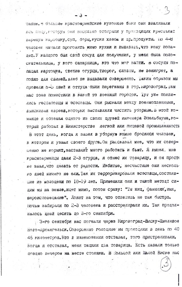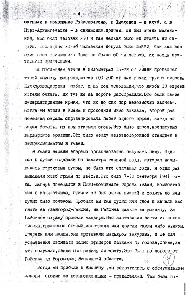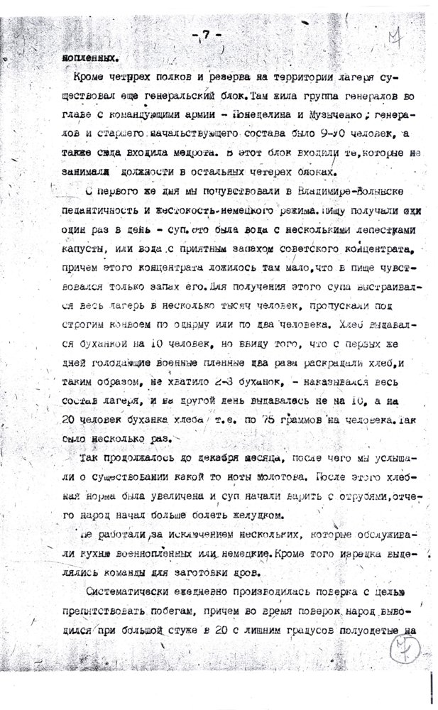 ...По дороге, когда нас гнали фашистские изверги 300 км этапом с собой, спасая его раненого жизнь, мы это расстояние поочерёдно группой по 4 человека, оказывая ему помощь, пронесли пешком до г.Кременчуг. из Кременчуга нас вывезли в г.Владимир-Волынск…