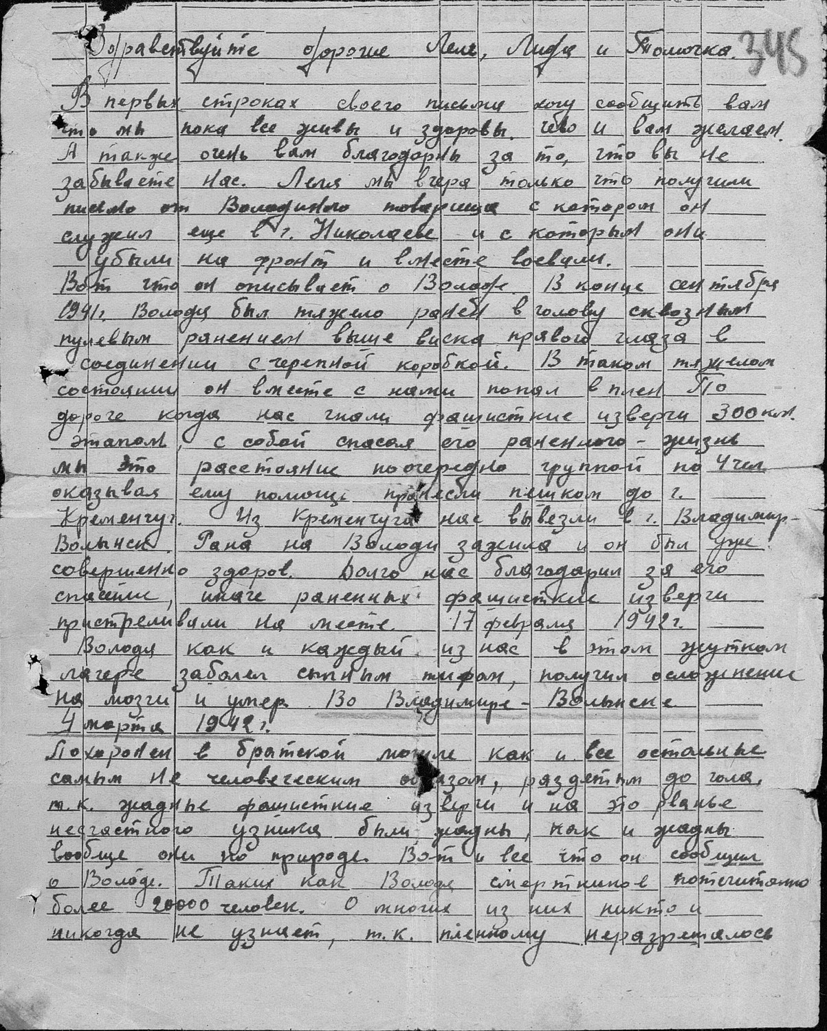...17 февраля 1942 года Володя, как и каждый из нас в этом жутком лагере, заболел сыпным тифом, получил осложнение на мозги и умер во Владимир-Волынске 4 марта 1942 года...