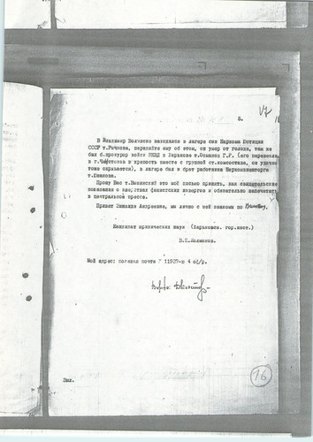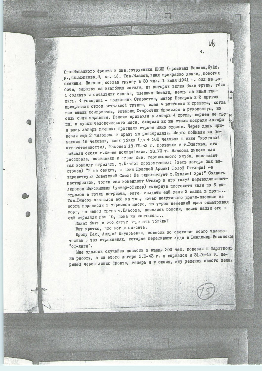 «Уважаемый Сергей Сергеевич! Мне хочется написать (Вам) об одном случае, который был в 1942 году, в конце июля месяца. Может быть, (Вам) о нём уже писали, потому, что это происходило на глазах сотен людей в гор(оде) Владимиро-Волынске УССР. Во Владимиро-Волынске был немецкий лагерь для советских военнопленных. Лагерь помещался в бывшем военном городке. В июле месяце много наших пленных (было) заключено в этот лагерь. В конце июля 1942 года в лагере на площади военного городка был расстрелян советский офицер. Кто он такой? Разговор был такой. Фамилия его – Власов, звание – майор, знал немецкий язык, работал при комендатуре, видимо – переводчиком. Он организовал побег военнопленных советских солдат (они делали подкоп из помещения) и убежал сам, но был пойман и расстрелян. При расстреле успел только сказать: «Да здравствует Советская Германия!» и ещё что-то (попытался), но уже не успел, подошёл фашист-офицер, подошёл к уже убитому, дал несколько выстрелов из своего оружия. Этот случай видело очень много солдат-пленных. Расстрел был сделан днём. Труп несли наши пленные. Может быть, остались в живых его товарищи, которые знали подлинное о его жизни, кто он, откуда он, этот славный воин? Извините за беспокойство! С приветом. Адрес: Василь-Сурск (Васильсурск) Горьковской области, улица Мира, д(ом) 39, Назаров Иван Ефимович. P.S. Фамилия (его) может быть не такая – за двадцать три года можно забыть (подпись)». Источник: РГАЛИ, ф.2528, оп.5, д.155. л.86-88".