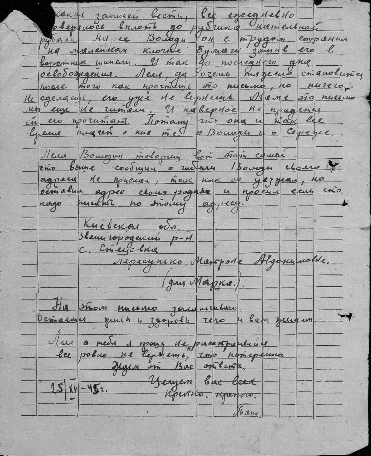 | Про письмо друга Авдейчука В. его родственникам