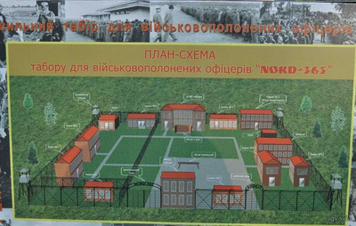 Сравнивая план и план-макет лагеря со старыми и современными картами-планами-схемами-аэрофотосъемками можно отметить, что на территории, где непосредственно находились советские военнопленные, имелось четырнадцать разноэтажных построек разного функционального назначения (идя по часовой стрелке, считая от центрального входа в лагерь):