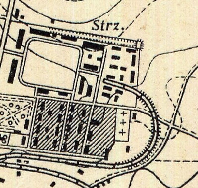 На современных картах (фото № 7, 8, 9) "Т-образное" здание в северо-западном углу лагеря видимо является перестроенным после войны зданием кухни № 1 (или вновь выстроенным зданием- на месте снесенного). Следует также отметить, что на схеме 1929 года (фото № 6) здание кухни № 1 четко не просматривается.