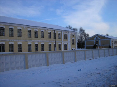 Бывший лазарет с генеральским блоком (снимок с территории городка). Справа от него виден торец мусульманского барака