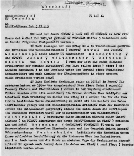 1. По свидетельствам офицеров и служащих вермахта из Офлага XIa во Влодзимеже [Владимир-Волынский] (оберлейт. Дувал и оберлейт. Лессенхоп – оба абвер, казначей Швартинг, служащие Янс, Телтхерстер, Биттинс, Зибен и Беттель) в данный момент ликвидируется все еврейское население Украины. Говорится, что из Киева было выведено 42000-48000(показания разнятся) под предлогом переселения. Затем у них забрали одежду и расстреляли в большом рву.